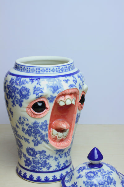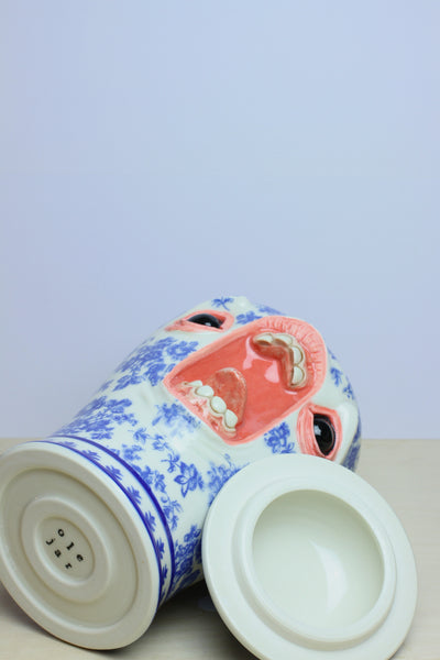Bring art and intrigue to your interior with this delft face jar. It’s one part floral heirloom, and one part fever dream.